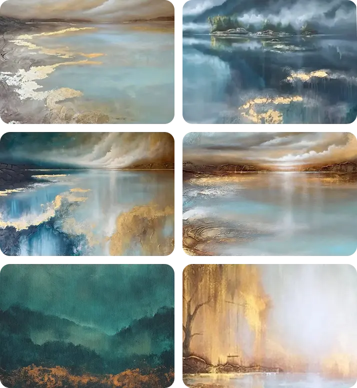 The golden elements will become part of your artwork, blending beautifully with colours to add depth, light, and atmosphere.